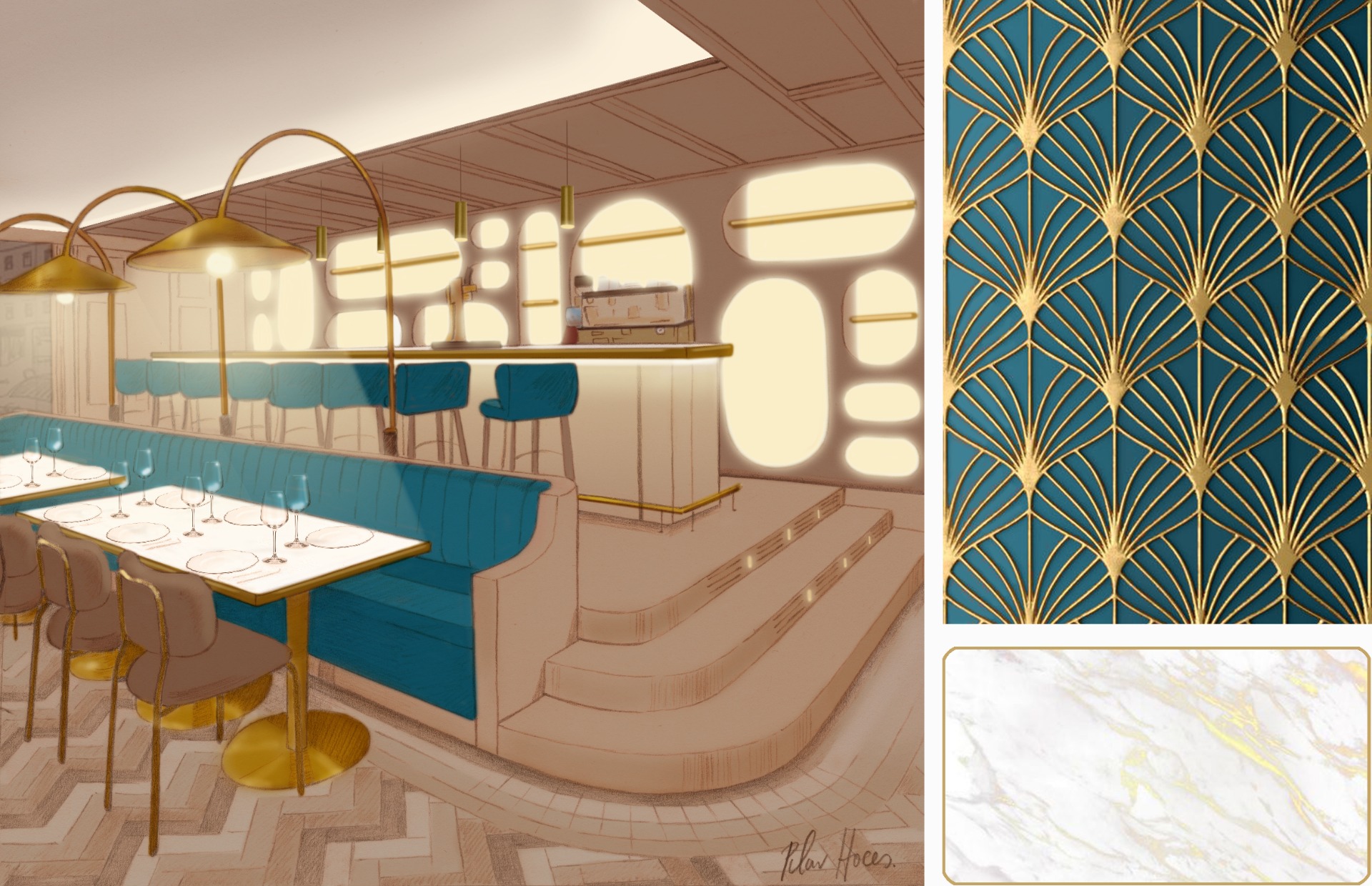Propuesta para cafetería. Dibujo a lápiz coloreado en Photoshop y fotomontaje