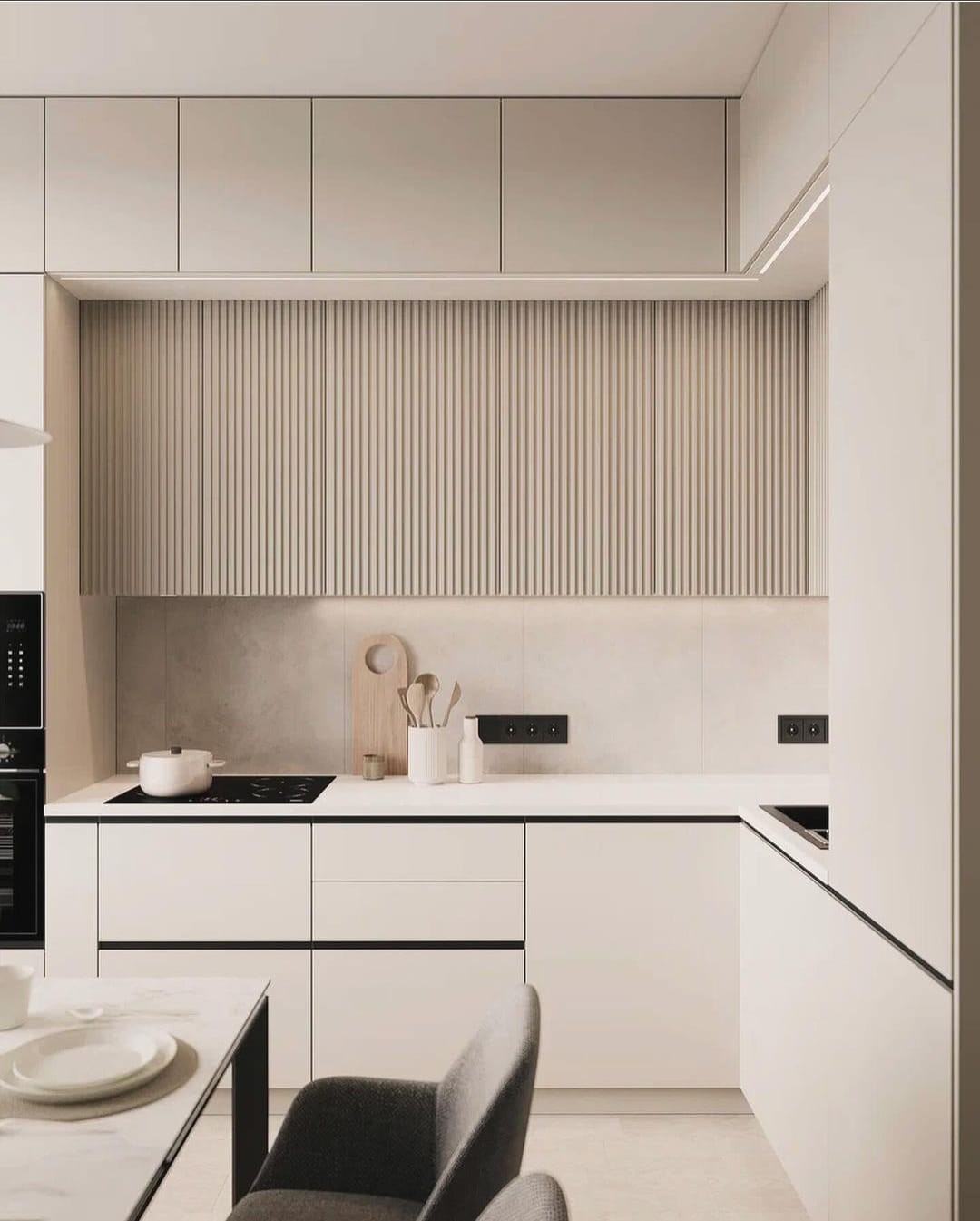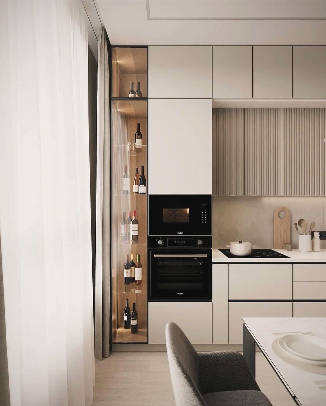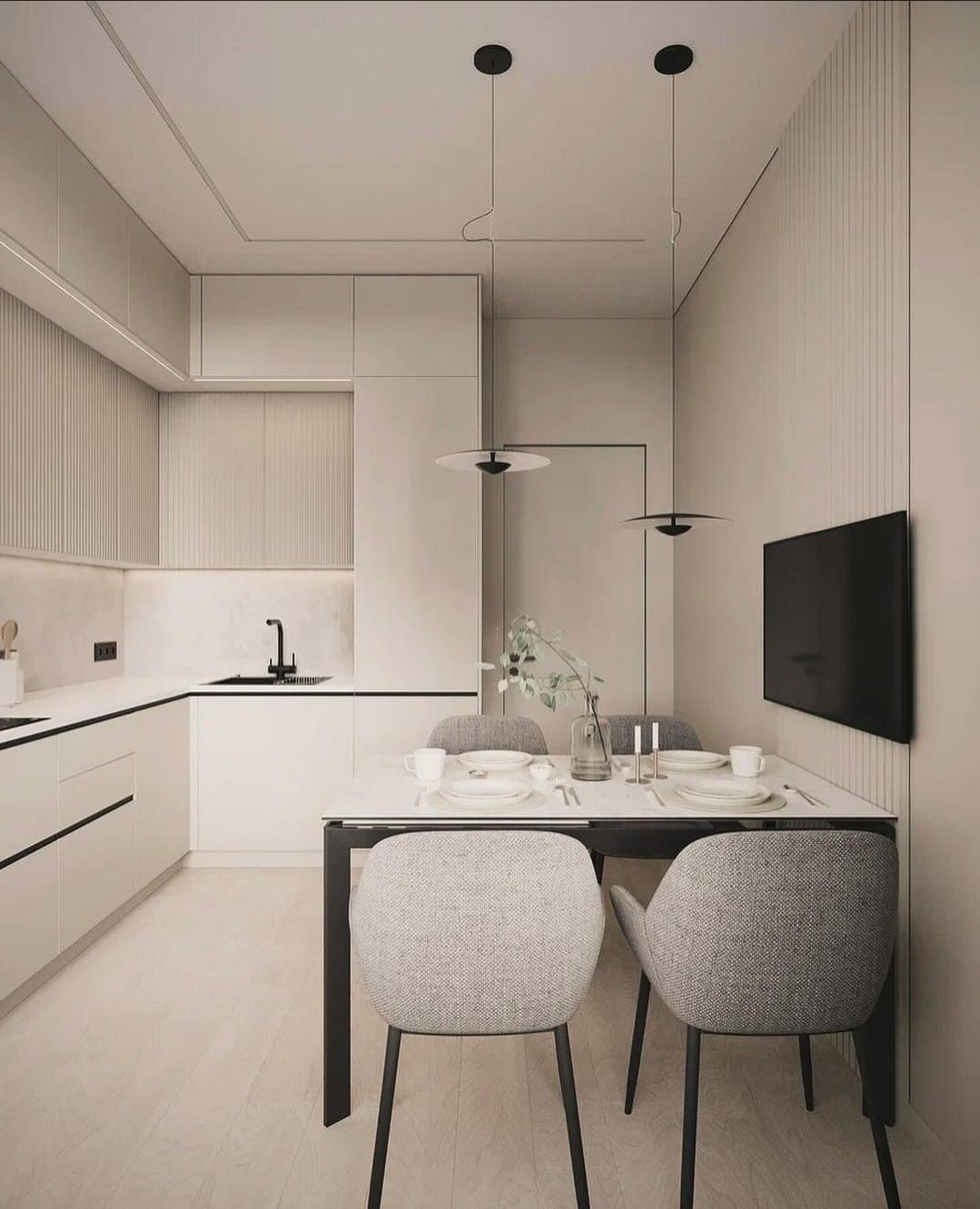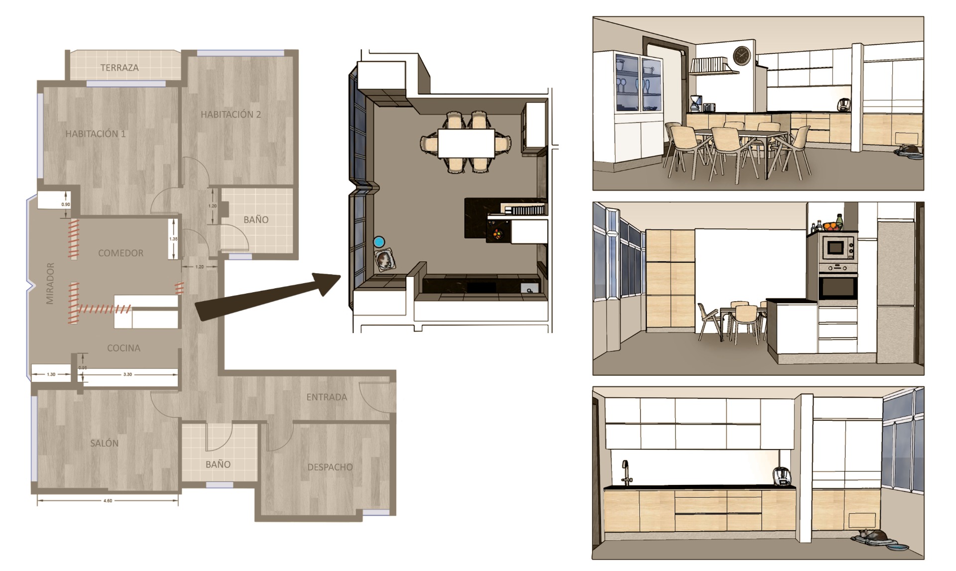 Propuesta de reforma de cocina y comedor en un solo espacio con península central. Infografías realizadas con SketchUp